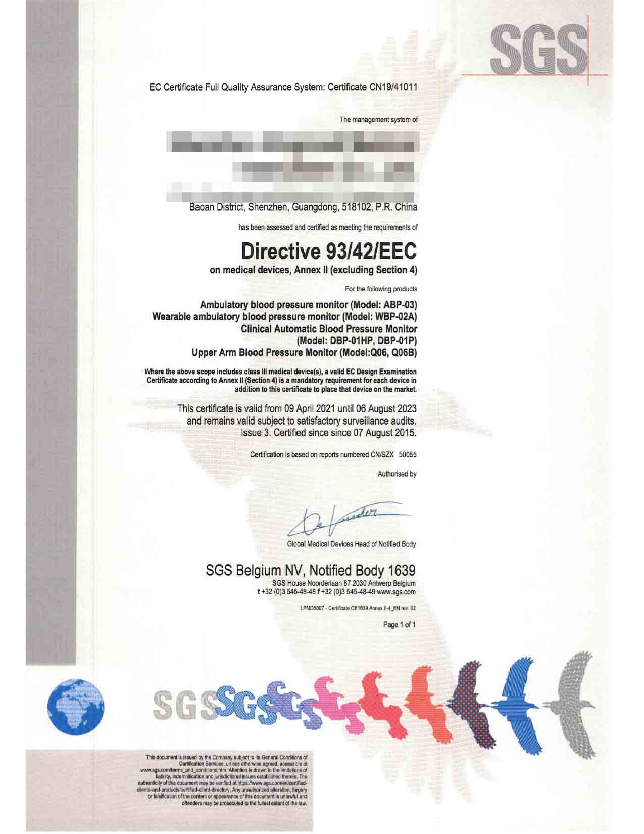 The wearable Blood pressure monitor of WBP-02A Hospital is mainly used to measure blood pressures, which includes systolic pressure, diastolic pressure and pulse rate, of patients in different setting intervals within 24 hours (not applicable to children under 3 years old), and the measurement data can be downloaded to computer system through USB cable.